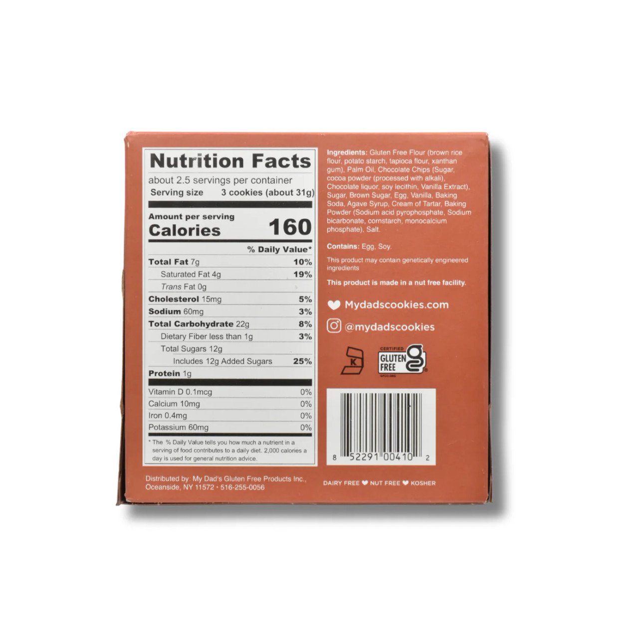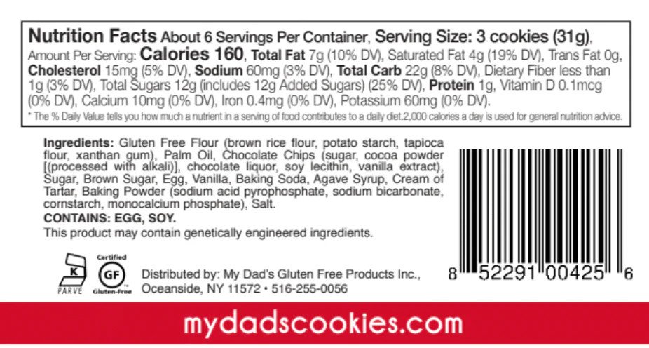 Deliciously addictive, our allergy-friendly Chocolate Chip cookie is a must-try for cookie enthusiasts! Cripsy vanilla-flavored cookie with chocolate chips! Ingredients: Gluten Free Flour (brown rice flour, potato starch, tapioca flour, xanthan gum), Palm Oil, Chocolate Chips (Sugar, cocoa powder (processed with alkali), Chocolate liquor, soy lecithin, Vanilla Extract), Sugar, Brown Sugar, Egg, Vanilla, Baking Soda, Agave Syrup, Cream of Tartar, Baking Powder (Sodium acid pyrophosphate, sodium bicarbonate, cornstarch, monocalcium phosphate), Salt. Contains: Soy, Egg. contains bioengineered food ingredients 6oz Package and Nutrition Facts shown 1 case contains 12 packages of cookies
