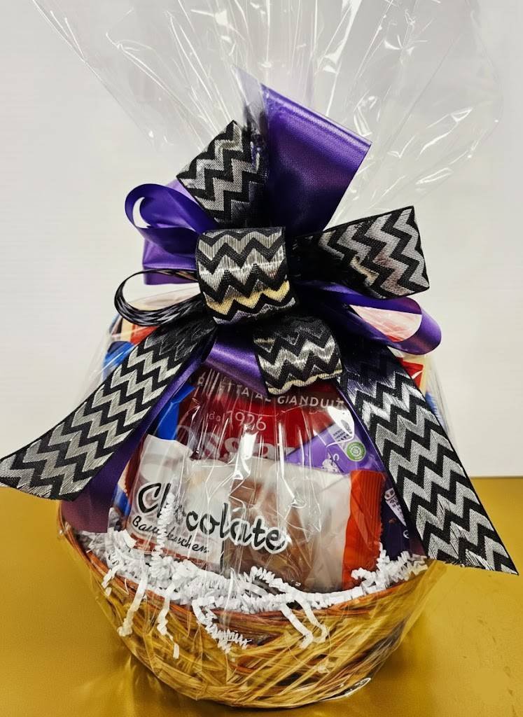 This a beautiful wicker basket is filled with the finest chocolates from around the world. Great for a office to share for a “Thank You” gift during the holidays. anyone who enjoys good chocolates will appreciate this gift . Send to a family for the holidays, this gift basket is perfect for anyone. Topped with a beautiful hand made Silver, black, Purples bow.