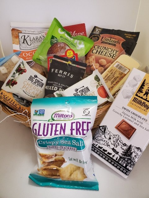 This wicker basket is filled with delicious gourmet GLUTEN FREE products. Apricot pepita peanut butter bar, mixed nuts, summer sausage. Coconut rice krispie treat, crispy sea salt crackers, Swiss chocolate, cheese, fruit mix, coconut macaroons, chocolate covered cherries, crunchy cheese bites. Coconut chips, cherry pecan nut butter bar