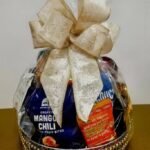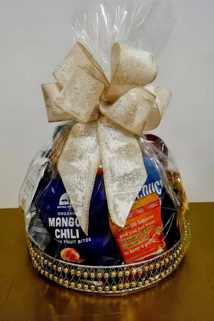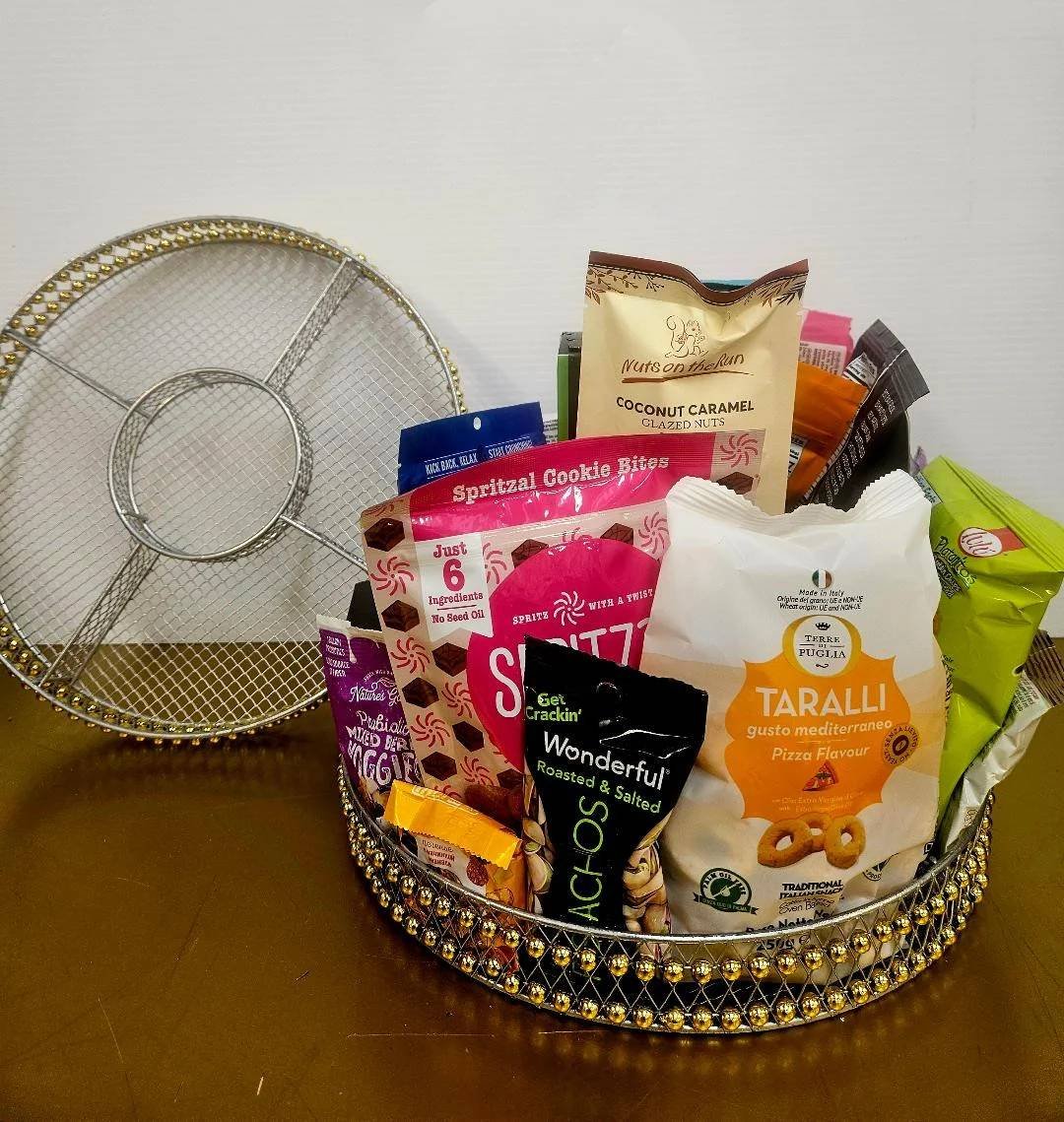 This beautiful silver metal 4 section tray with gold beads is filled with the finest gourmet treats. A little of everything for everyone to enjoy