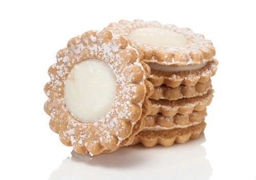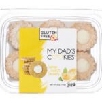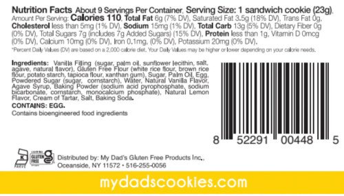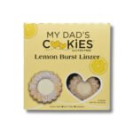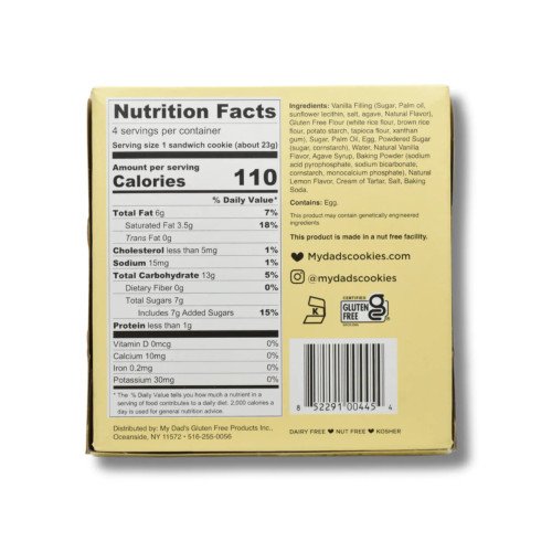 A burst of sunshine in every bite – our melt-in-your-mouth Lemon Burst Linzer cookie is pure delight! Two vanilla cookies filled with lemon-flavored cream and topped with powdered sugar. Ingredients: Vanilla Filling (sugar, palm oil. sunflower lecithin, soybean oil. mono and diglycerides, TBHQ and citric acid, salt, agave, natural flavor), Gluten Free Flour (white rice flour, brown rice flour, potato starch, tapioca flour, xanthan gum), Sugar, Palm Oil, Egg, Powdered Sugar (sugar, cornstarch), Water, Natural Vanilla Flavor, Agave Syrup, Baking Powder (sodium acid pyrophosphate, sodium bicarbonate, cornstarch, monocalcium phosphate), Natural Lemon Flavor, Cream of Tartar, Salt, Baking Soda. Contains: Egg. contains bioengineered food ingredients 6oz Package and Nutrition Facts shown 1 case contains 12 packages of cookies