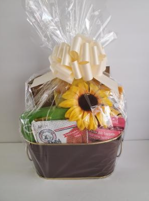 This beautiful brown and gold tin is filled with scrumptious sweet and savory gourmet treats. The perfect hostess gift, thank you gift, new home gift and a “just because gift”
