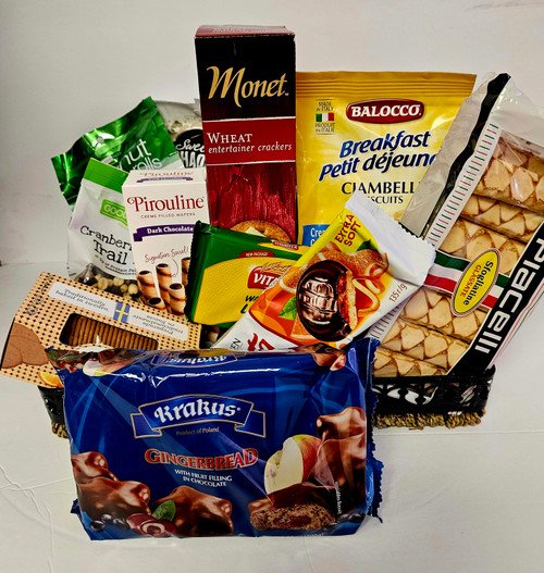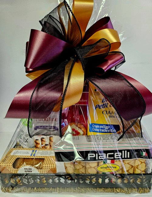 This unique metal silver tray is filled with delicious gourmet treats. cheese, assorted nuts, cannoli chips, assorted chocolates(is substitute in warm weather) wine and cheese biscuit’s, assort cookies, cheese crackers, pretzels, cookie tarts, focaccia crisps. Good for many occasions. If for a sympathy there is enough on this tray for people to share when family or friends come for a visit